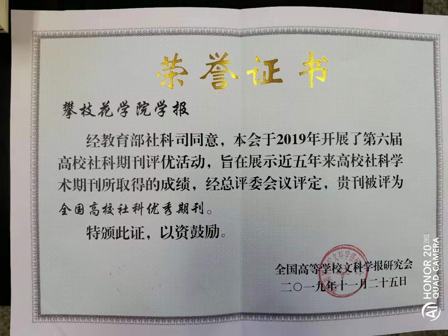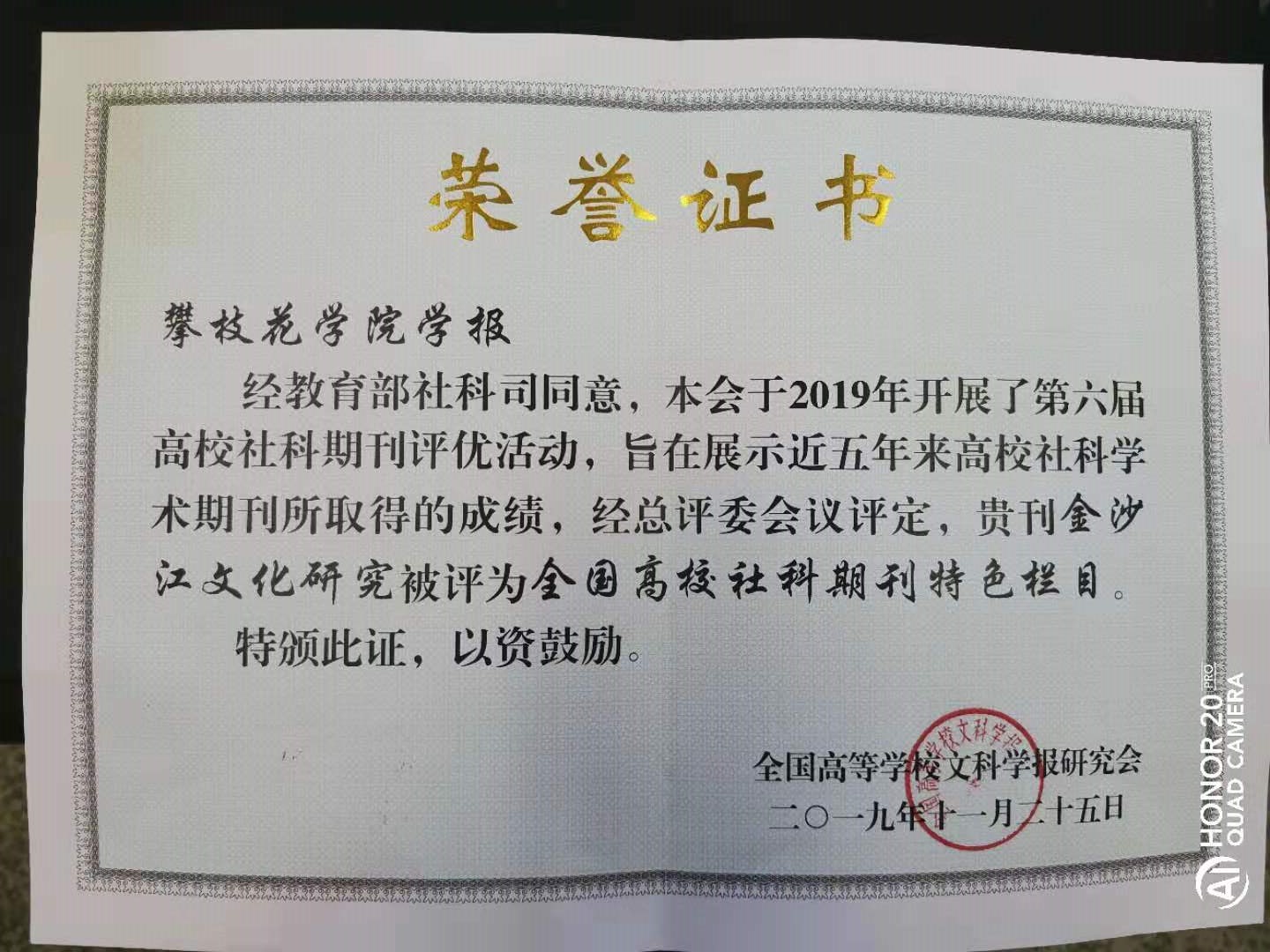 在2019年全国高校文科学报研究会第六届高校社科期刊评优活动中,《攀枝花学院学报》被评为“全国高校社科优秀期刊”,学报“金沙江文化研究”栏目被评为“全国高校社科期刊特色栏目”。